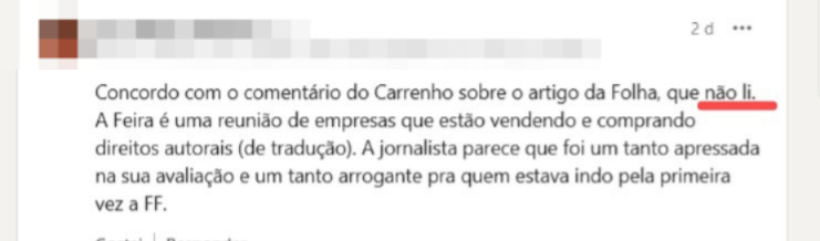 Nesse caso, se o comentarista estivesse lá realmente fazendo algo prático, útil, real, talvez a livraria que ele propala tanto amar tivesse condições de participar. Melhor ainda, se estivesse lendo livros da tal livraria, não estaria mendigando atenção nas redes sociais.